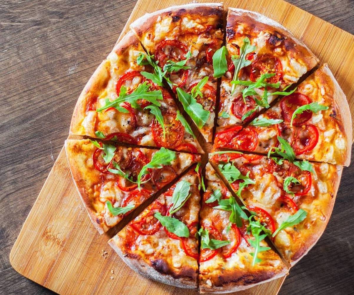 Färska tomater, ost, tomatsås, ruccolasallad och parmaskinka